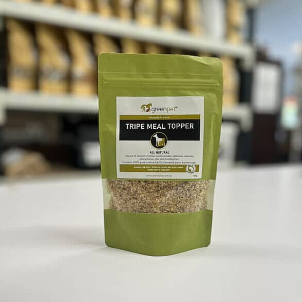 Greenpet tripe meal topper is green tripe from grass-fed cows that is unbleached & untreated. It has been lightly rinsed with hot water to remove any bacteria.