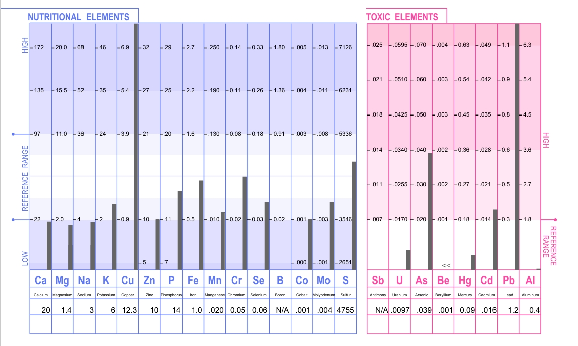 Nutritional elements tested: Boron, Calcium, Chromium, Cobalt, Copper, Iron, Magnesium, Manganese, Molybdenum, Phosphorus, Potassium, Selenium, Sodium, Sulfur and Zinc.