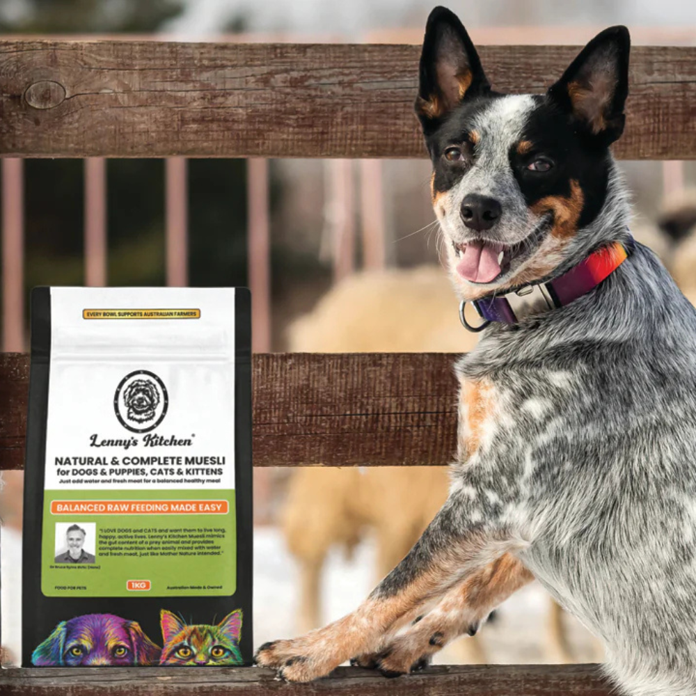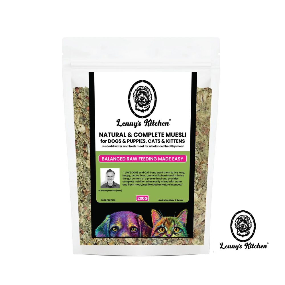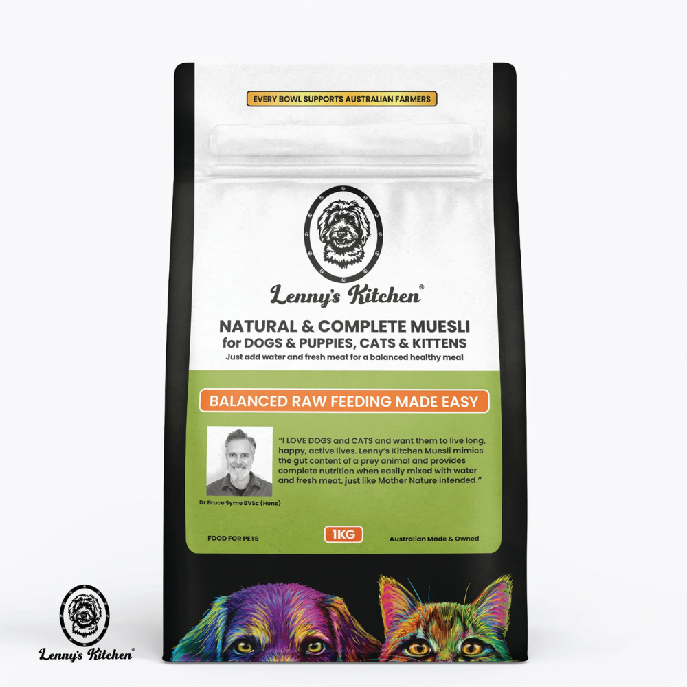 Lenny’s Kitchen Natural & Complete Muesli for dogs, puppies, cats and kittens is formulated in conjunction with renowned and respected Australian Vet, Dr Bruce Syme BVSc (Hons). Dr Bruce practices as an Integrative Vet, blending conventional and complementary therapies to achieve the best outcome. He has been a passionate advocate for raw, natural feeding for over 30 years.