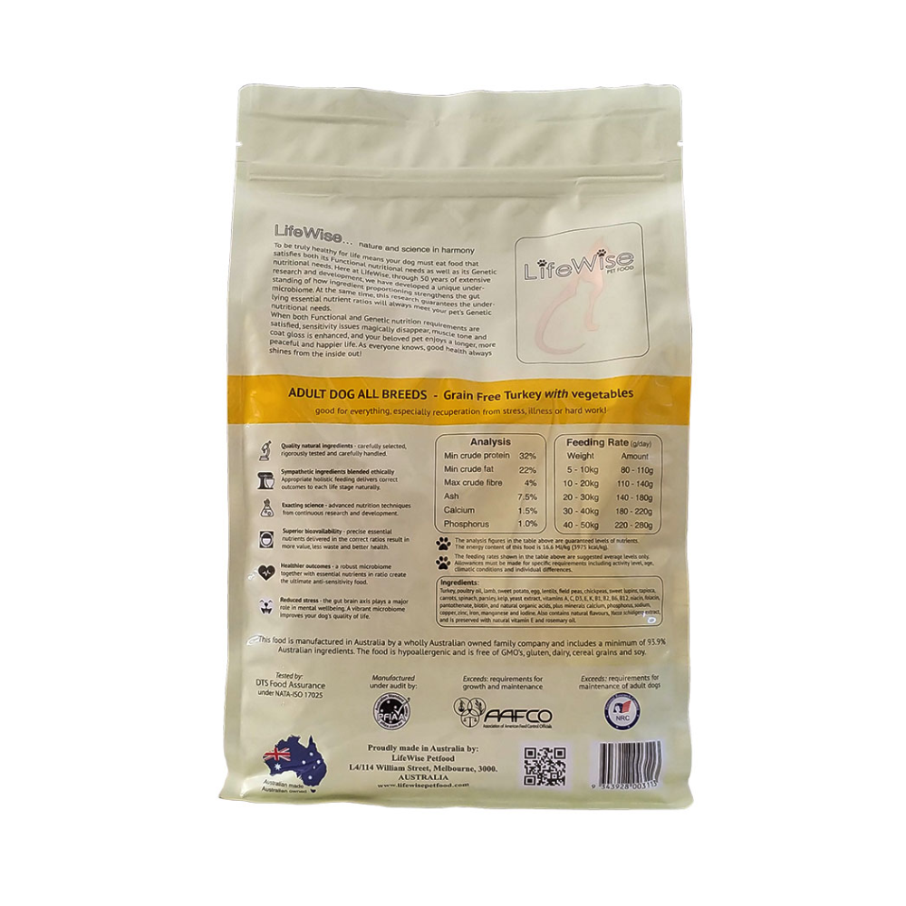 Lifewise Turkey kibble is made with healthy turkey meat with mixed vegetables, vitamins, minerals and essential oils. Scientifically balanced holistic food for all dogs. A concentrated, high profile diet especially useful for canine athletes, dogs with a high work load, or animals that are recuperating from illness or surgery. The unique nutrient ratios coupled with the very high digestibility levels also make this food admirably suited to dogs subjected to high levels of stress such as guard dogs, police dogs or those working in military and domestic security fields. This food also contains kelp and yeast extracts for optimum intestinal health plus Yucca schidigera extract.